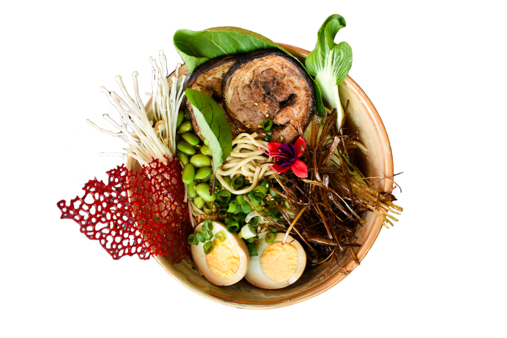 pork and beef stock, ramen noodles, chashu bacon, enoki, edamame, egg, pak-choi -